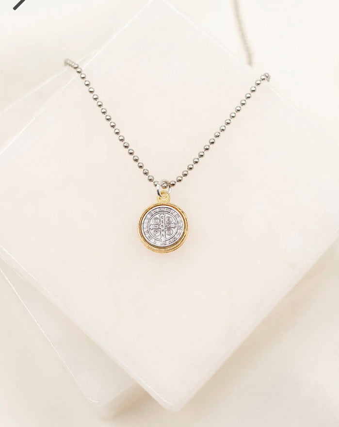 My Saint My Hero Benedictine Blessing Gold Rim Necklace