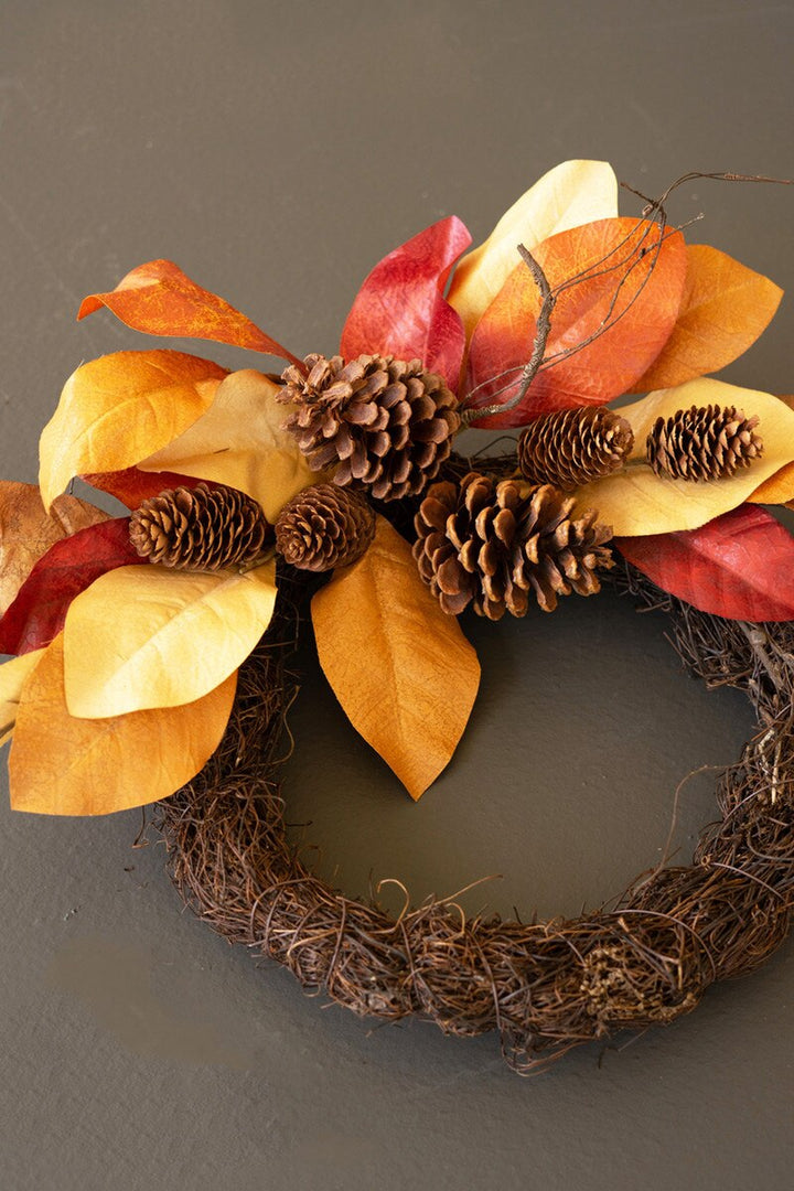 Fall Faux Dried Magnolia Leaves and Pine Cones Wreath