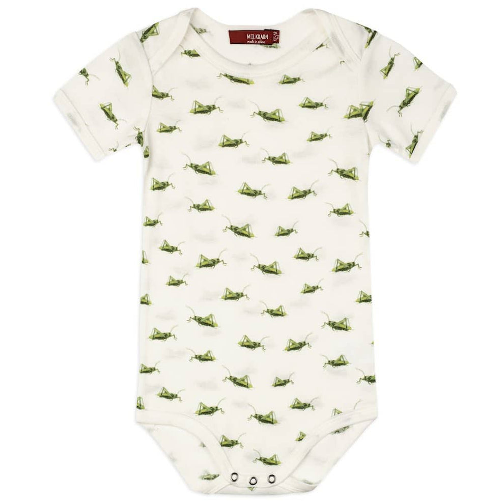 Milk Barn's soft and soothing baby Organic Cotton One Piece in the Grasshopper print merges understated form and functionality. The envelope neckline and ring-snap closures allow for effortless, one-handed undressing of your little one.