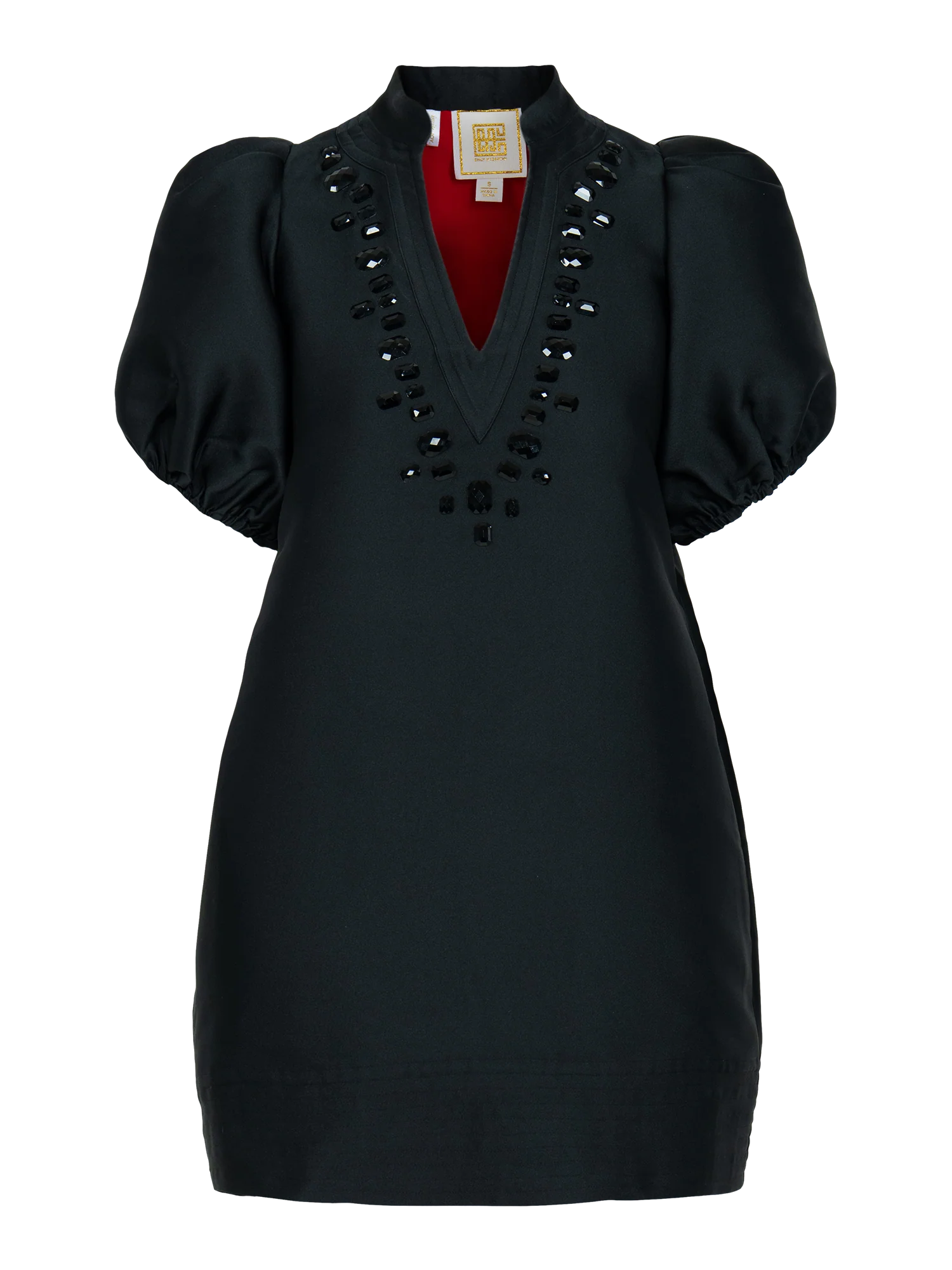 The Hampton Mini in Midnight is a refined yet playful dress featuring puff sleeves, side pockets, and a mandarin-style collar. Its neckline is framed with monochrome stones for a subtle statement, adding just the right touch of party-forward detail. Finished with a bold red lining for an unexpected pop of color, this mini is equal parts elevated and fun.