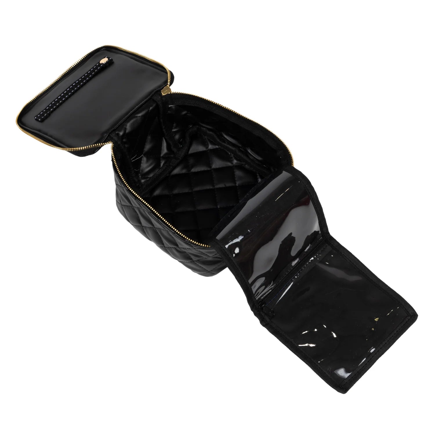 NO MORE TANGLES. Bracelets, earrings, necklaces rings? Bring all the jewelry you want for a long weekend because this soft, square, compartmentalized jewelry case can handle it all. There's a roomy main compartment, two roll-out (attached) clear zip pockets, and a strap in the lid to secure rings or whatnot. Zips open from either side and sits upright for easy loading/viewing.