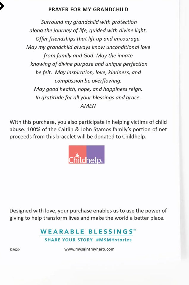 With your purchase of this St. Amos Blessing Bracelet, you also participate in helping victims of child abuse. 100% of the Caitlin & John Stamos family’s portion of net proceeds from this bracelet will be donated to Childhelp for the Prevention and Treatment of Child Abuse.